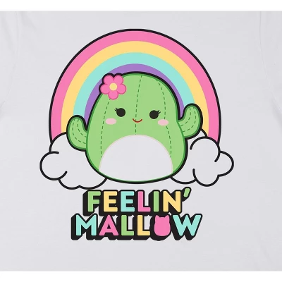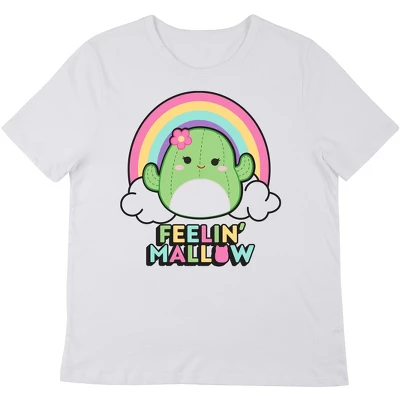 Cozy up with your favorite Squishmallows and this comfy tee. The shirt features an image of Maritza the Cactus sitting in front of a rainbow while pastel letters below the Maritza read, “Feelin’ Mallow.” The tee comes in a white and green ombre short sleeve crew neck. Squishmallows fans will love this comfy tee.