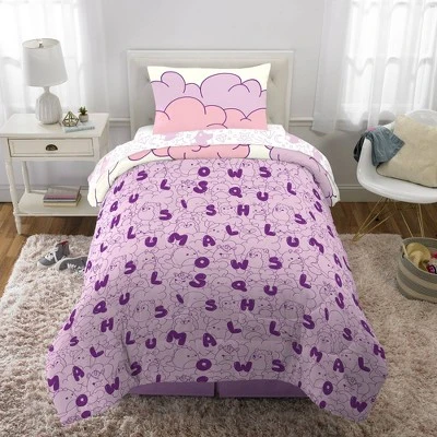 This reversible twin-sized comforter features favorite characters in a colorful cloud design. If looking for something more subtle, just flip the comforter over for a monochromatic purple design.